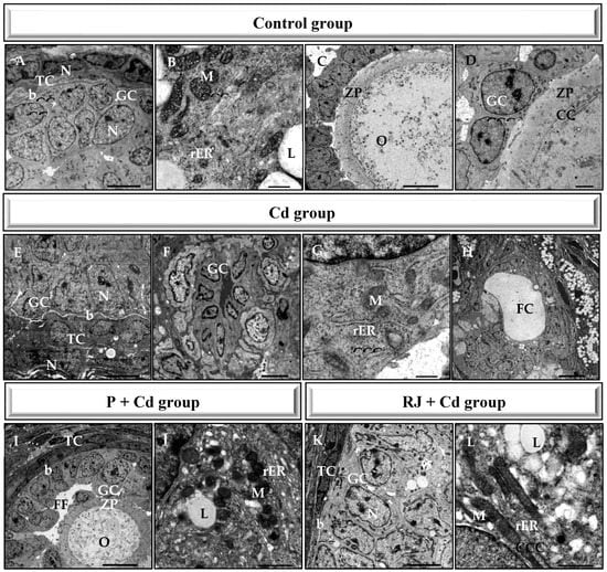 Ultrastructure features of the ovarian tissue from control rats exhibited healthy follicles. Oocytes contained within the follicles displayed mitochondria with intact cristae and a well-developed rough endoplasmic reticulum. Normal zona pellucida, which is tightly opposed to both the oocyte and the surrounding granulosa cell layer, was observed (Figure 5A–D). Like the semithin sections, the ultrastructure of the ovarian tissues treated with either P or RJ alone manifested no characteristic changes, whereas Cadmium administration mediated aberrations in the ovarian tissue comprising fewer and smaller oocytes, deformed granulosa cells, and follicles with thick theca cell lining. Moreover, compared with the ovarian tissue from the controls, the corrugated basement membrane of the follicle, follicular cyst, vacuolation, and follicular space filled with fluid (Figure 5E–H). Meanwhile, in the P + Cd animals (Figure 5I,J), as well as in the RJ + Cd ovaries (Figure 5K,L), there were no morphological defects in the ultrastructure, even though some mild signs of degeneration were observed.