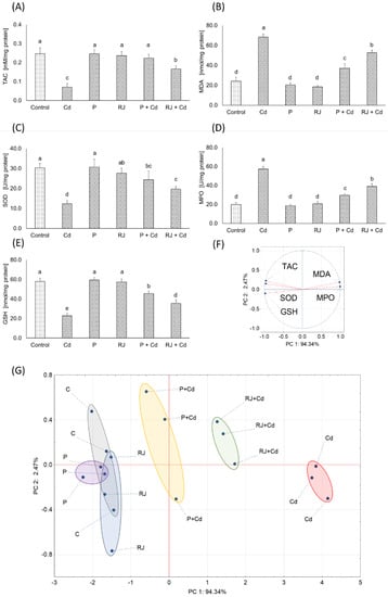 Oxidative stress markers in females’ ovaries. (A) total antioxidant capacity (TAC); (B) malondialdehyde concentration (MDA); (C) superoxide dismutase (SOD) and (D) myeloperoxidase (MPO) activity; (E) reduced glutathione (GSH) concentration. (F) Principal component analysis (PCA) on oxidative stress markers variables, and (G) 2D PCA plot of control and experimental group cases. The same letters in each chart, a–e denotes homogenous groups (ANOVA; HSD Tukey test; p < 0.05). Shape colors in (G) denote: gray—Control group, violet—Propolis group, blue—Royal Jelly group, yellow—Cadmium + Propolis group, green—Cadmium + Royal Jelly group, red—Cadmium group.