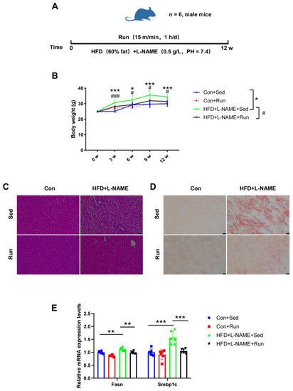 Exercise protects against liver steatosis in NAFLD mice. (A) The exercise schedule of NAFLD mice. (B) The body weight of mice. (C) The liver steatosis of mice determined by H&E staining. (D) The liver lipid content of mice detected by Oil Red O staining. (E) The mRNA levels of the genes related to liver lipogenesis (Fasn and Srebp1c) relative to GAPDH in the livers of mice. * p < 0.05, ** p < 0.01, *** p < 0.001; # p < 0.05, ### p < 0.001; n = 6. Sed, sedentary; HFD, high-fat diet; L-NAME, Nω-nitro-L-arginine methyl ester, hydrochloride; Fasn, fatty acid synthase; Srebp1c, sterol regulatory element binding protein-1c. Scale bar = 25 μm.