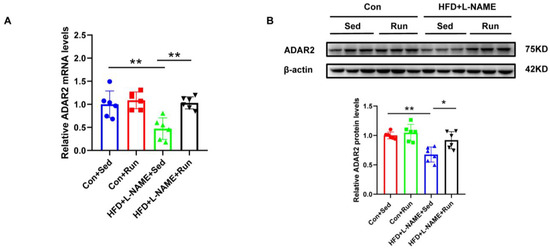 Hepatic ADAR2 is ameliorated by exercise in the group with diet-induced NAFLD mice. (A) The mRNA levels of ADAR2 relative to GAPDH in the mouse livers were analyzed by qRT-PCR. (B) The protein levels of ADAR2 in the mouse livers were detected using Western blotting. * p < 0.05, ** p < 0.01; n = 6. Sed, sedentary; HFD, high-fat diet; L-NAME, Nω-nitro-L-arginine methyl ester, hydrochloride; ADAR2, adenosine deaminases acting on RNA 2. ● Con+Sed; ■ Con+Run; ▲ HFD+L-NAME+Sed; ▼ HFD+L-NAME+Run.