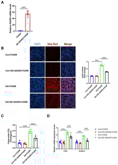 ADAR2 overexpression suppresses lipogenesis in hepatocytes. (A) The mRNA levels of ADAR2 relative to GAPDH were analyzed by qRT-PCR after transfection with the ADAR2 overexpression plasmid in HepG2 cells. (B) The lipid content of HepG2 cells was determined by Nile Red staining. (C) The TG levels of HepG2 cells. (D) The mRNA levels of lipogenesis-related genes (Fasn and Srebp1c) relative to GAPDH were analyzed by qRT-PCR. *** p < 0.001; n = 6. OE, overexpression; OA, oleic acid; TG, triglyceride; ADAR2, adenosine deaminases acting on RNA 2; Fasn, fatty acid synthase; Srebp1c, sterol regulatory element binding protein-1c. Scale bar = 100 μm.
