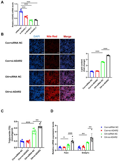 ADAR2 knockdown accelerates lipogenesis in hepatocytes. (A) The mRNA levels of ADAR2 relative to GAPDH were analyzed by qRT-PCR after transfection with ADAR2-siRNA in HepG2 cells. (B) The lipid content of HepG2 cells was determined by Nile Red staining. (C) The TG levels of HepG2 cells. (D) The mRNA levels of lipogenesis-related genes (Fasn and Srebp1c) relative to GAPDH were analyzed by qRT-PCR. * p < 0.05, ** p < 0.01, *** p < 0.001; n = 6. OA, oleic acid; TG, triglyceride; ADAR2, adenosine deaminases acting on RNA 2; Fasn, fatty acid synthase; Srebp1c, sterol regulatory element binding protein-1c. Scale bar = 100 μm.