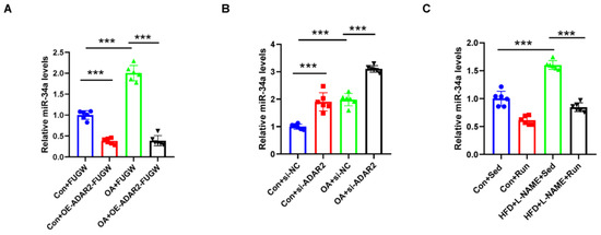 miR-34a is negatively regulated by ADAR2. (A) The miR-34a levels relative to U6 were analyzed by qRT-PCR after transfection with ADAR2 overexpression plasmid/vector in HepG2 cells. ● Con+FUGW; ■ Con+OE-ADAR2-FUGW; ▲ OA+FUGW; ▼ OA+OE-ADAR2-FUGW. (B) The miR-34a levels relative to U6 were analyzed by qRT-PCR after transfecting with ADAR2-siRNA/vector in HepG2 cells. ● Con+si-NC; ■ Con+si-ADAR2; ▲ OA+si-NC; ▼ OA+si-ADAR2. (C) The miR-34a levels relative to U6 in the livers of mice with NAFLD. ● Con+Sed; ■ Con+Run; ▲ HFD+L-NAME+Sed; ▼ HFD+L-NAME+Run. *** p < 0.001; n = 6. OE, overexpression; OA, oleic acid; Sed, sedentary; HFD, high-fat diet; L-NAME, Nω-nitro-L-arginine methyl ester, hydrochloride; ADAR2, adenosine deaminases acting on RNA 2.