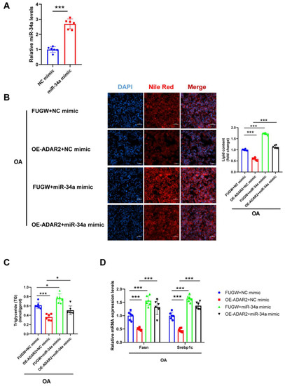 As miR-34a is negatively regulated by ADAR2 in hepatocytes, we further explored the role of miR-34a in hepatic lipogenesis. First, miR-34a was downregulated after transfection with miR-34a inhibitor (Figure 7A). As a result, miR-34a inhibitor decreased the lipid content (Figure 7B,C), whereas miR-34a mimicking raised the lipid content (Figure 8A,B) in HepG2 cells during OA treatment, as determined by Nile Red staining and the TG levels. Consistently, the protective effects of miR-34a inhibitor (Figure 7D) and the deterioration effect of miR-34a mimic (Figure 8C) in OA-induced lipid generation were also confirmed by the expression of Fasn and Srebp1c. Overall, our findings illustrated that miR-34a could induce lipid accumulation in HepG2 cells.