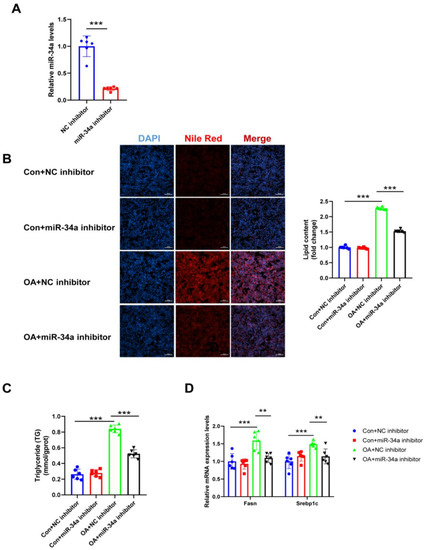 Effects of miR-34a inhibitor on lipogenesis in hepatocytes. (A) The expression levels of miR-34a relative to U6 were analyzed by qRT-PCR after transfection with miR-34a inhibitor in HepG2 cells. (B) The lipid content of HepG2 cells was determined by Nile Red staining. (C) The TG levels of HepG2 cells. (D) The mRNA levels of lipogenesis-related genes (Fasn and Srebp1c) relative to GAPDH were analyzed by qRT-PCR. ** p < 0.01, *** p < 0.001; n = 6. OA, oleic acid; TG, triglyceride; Fasn, fatty acid synthase; Srebp1c, sterol regulatory element binding protein-1c. Scale bar = 100 μm.