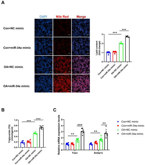 Effects of miR-34a mimicking on lipogenesis in hepatocytes. (A) The lipid content of HepG2 cells was determined by Nile Red staining. (B) The TG levels of HepG2 cells. (C) The mRNA levels of lipogenesis-related genes (Fasn and Srebp1c) relative to GAPDH were analyzed by qRT-PCR. ** p < 0.01, *** p < 0.001; n = 6. OA, oleic acid; TG, triglyceride; Fasn, fatty acid synthase; Srebp1c, sterol regulatory element binding protein-1c. Scale bar = 100 μm.