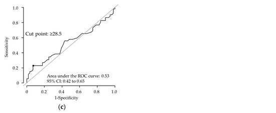 Demographics, erythrocyte-, iron- and nutrition-related parameters, CRP, HD efficiency, antacid use, and iron preparations were compared with the effective and ineffective groups; only CRP was significantly different (Table 1, Figure 2a). ROC curve analysis with efficacy as the endpoint showed a cut point of CRP ≤ 0.1 mg/dL (sensitivity 63.1%, specificity 70.8%, area under the curve [AUC] 0.69, 95% confidence interval [CI] 0.57–0.81: Figure 2b). Logistic regression analysis showed a significantly lower odds ratio (OR) for patients with CRP > 0.1 mg/dL than for those with CRP ≤ 0.1 mg/dL (OR 0.24, 95% CI 0.09–0.65, p < 0.01: Table 2). In addition, CRP was significantly lower in the effective group than in the ineffective group during the observation period (p = 0.01; Figure 2c).