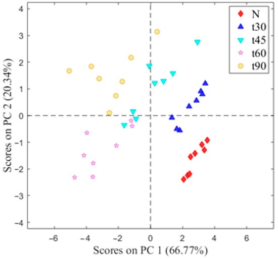The PCA results showed that 66.7% of the total variance of data was explained by PC1 and 20.3% by PC2. This model based on the first two components showed a clear differentiation of the samples according to the volatile compounds profile. In this sense, almond oils from kernels subjected to different thermal treatments were separated in different groups. In addition, the oil extracted from untreated almonds (N) also clearly differed from the rest.