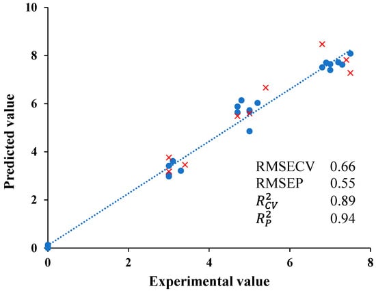 Experimental values against PLS cross-validation predictions (●) and validation set predictions (×) for burned aroma defect perceived by panelists.
