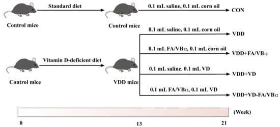 After adaptive feeding for 2 weeks, forty mice were randomly and equally divided into five groups based on initial body weights evenly. The five groups are as follows: Control group (CON), Vitamin D deficient group (VDD), Vitamin D deficient and folic acid/vitamin B12 supplemented group (VDD + FA/VB12), Vitamin D deficient and vitamin D supplemented group (VDD + VD), Vitamin D deficient and vitamin D, folic acid/vitamin B12 supplemented group (VDD + VD-FA/VB12). Control mice were fed an AIN93 standard diet, and VDD mice were fed a vitamin D-deficient diet for 13 weeks to establish a vitamin D-deficient mice model [5]. Following this, the mice were supplemented with cholecalciferol (1000 IU/kg), folic acid (13 mg/kg), and vitamin B12 (80 ug/kg), respectively, by oral gavage, the control group was maintained with the same volumes of saline and corn oil, four times a week and this lasted for 8 weeks. The flow chart is shown in Figure 1. The vitamin D-deficient diet compositions were shown in Supplementary Table S1. The dose of supplement was according to the study published previously [21]. After 21 weeks of intervention, behavioral tests were conducted, then the mice were anesthetized followed by collecting the blood samples and fresh tissues. All of the samples were then frozen at −80 °C until use.