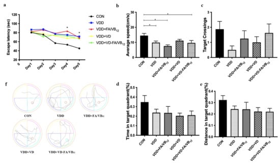 Spatial learning and memory ability in mice via Morris water maze. (a) Escape latency; (b) Average speed; (c) Number of platform-site crossovers; (d) Time in the target quadrant; (e) Distance in the target quadrant; (f) Tracks of probe trial. CON: control; VDD: vitamin D-deficient diet; VDD + FA/VB12: vitamin D-deficient diet plus folic acid/vitamin B12 supplement; VDD + VD: vitamin D-deficient diet plus vitamin D supplement; VDD + VD-FA/VB12: vitamin D-deficient diet plus vitamin D and folic acid/vitamin B12. All data are presented as the mean ± SEM (n = 8). A two-sided p < 0.05 was considered statistically significant.