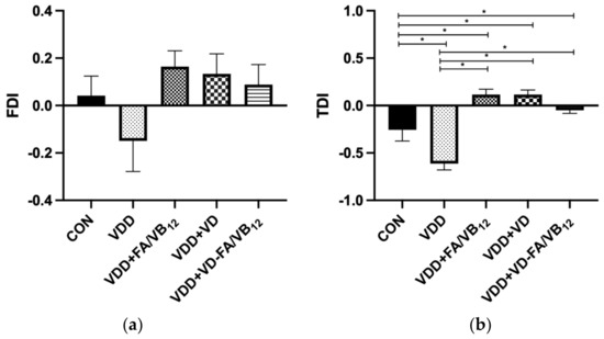 Short-term memory in mice tested by novel object recognition. (a) FDI; (b) TDI; CON: control; VDD: vitamin D-deficient diet; VDD + FA/VB12: vitamin D-deficient diet plus folic acid/vitamin B12 supplement; VDD + VD: vitamin D-deficient diet plus vitamin D supplement; VDD + VD-FA/VB12: vitamin D-deficient diet plus vitamin D and folic acid/vitamin B12; FDI: frequency discrimination index; TDI: time discrimination index. All data are presented as the mean ± SEM (n = 8). A two-sided p < 0.05 was considered statistically significant.