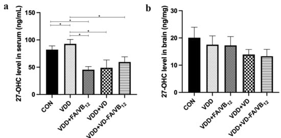 27-OHC concentration in serum and brain. (a) 27-OHC level in serum; (b) 27-OHC level in brain. CON: control; VDD: vitamin D-deficient diet; VDD + FA/VB12: vitamin D-deficient diet plus folic acid/vitamin B12 supplement; VDD + VD: vitamin D-deficient diet plus vitamin D supplement; VDD + VD-FA/VB12: vitamin D-deficient diet plus vitamin D and folic acid/vitamin B12. All data are presented as the mean ± SEM (n = 3). A two-sided p < 0.05 was considered statistically significant.