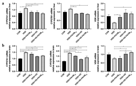 The gene expression of CYP27A1, CYP27B1, and VDR in liver and brain. (a) CYP27A1, CYP27A1and VDR mRNA in livers; (b) CYP27A1, CYP27A1and VDR mRNA in brains. CON: control; VDD: vitamin D-deficient diet; VDD + FA/VB12: vitamin D-deficient diet plus folic acid/vitamin B12 supplement; VDD + VD: vitamin D-deficient diet plus vitamin D supplement; VDD + VD-FA/VB12: vitamin D-deficient diet plus vitamin D and folic acid/vitamin B12. All data are presented as the mean ± SEM (n = 4). A two-sided p < 0.05 was considered statistically significant.