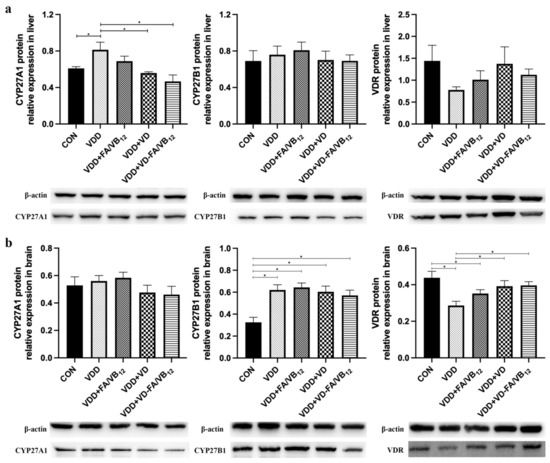 The protein expression of CYP27A1, CYP27B1, and VDR in liver and brain. (a) CYP27A1, CYP27A1and VDR protein in livers; (b) CYP27A1, CYP27A1and VDR protein in brains. CON: control; VDD: vitamin D-deficient diet; VDD + FA/VB12: vitamin D-deficient diet plus folic acid/vitamin B12 supplement; VDD + VD: vitamin D-deficient diet plus vitamin D supplement; VDD + VD-FA/VB12: vitamin D-deficient diet plus vitamin D and folic acid/vitamin B12. All data are presented as the mean ± SEM (n = 4). A two-sided p < 0.05 was considered statistically significant.