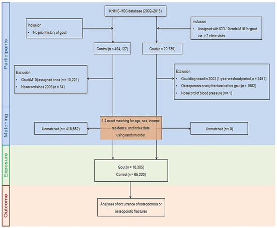 Subsequently, we reviewed the outbreak of newly diagnosed osteoporosis or osteoporotic fractures (newly assigned ICD-10 codes for osteoporosis or osteoporotic fractures) in gout and comparison groups from the respective person’s index date until the last day of 2015.