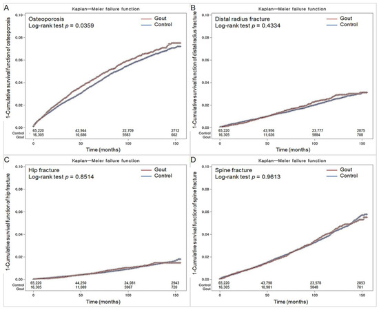 Similar probabilities of developing osteoporotic fractures on the distal radius, hip, or spine were observed between gout and control groups in the Kaplan–Meier analysis (p = 0.4334, p = 0.8514, and p = 0.9613, respectively; Figure 2B–D).