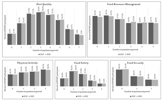 There was no difference in the percentage of participants showing improvement in one or more questions for each domain (diet quality, p = 0.11; physical activity, p = 0.74; food safety, p = 0.38; food resource management, p = 0.99; food security, p = 0.94) between FFY2019 and FFY2020 as determined by ANOVA. These results are further supported when examining the distributions for the number of improved questions in each domain, where few substantial differences can be seen between FFY2019 and FFY2020 (Figure 1).