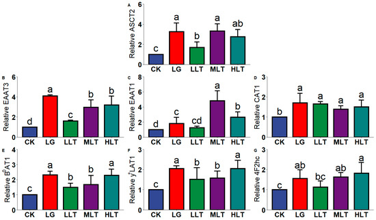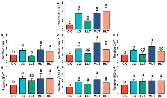 Figure 2. Effects of L-theanine on mRNA expression of amino acid transporters of (A) ASCT2, (B) EAAT3, (C) EAAT1, (D) CAT1, (E) B0AT1, (F) y+LAT1, and (G) 4F2hc in the jejunum of mice. CK (control), HLT (LTA—400 mg•kg−1•d−1), MLT (LTA—300 mg•kg−1•d−1), LLT (LTA—100 mg•kg−1•d−1), and LG (L-glutamine—300 mg•kg−1•d−1) groups. Values are presented as mean ± SD; n = 10/group. Different superscript letters in the same figure indicate statistically significant differences (p < 0.05).