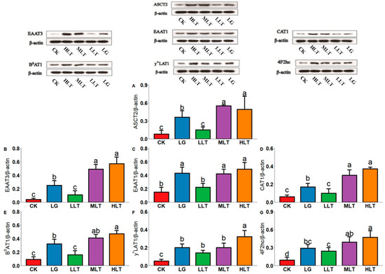 Figure 3. Effects of L-theanine on the protein expression of amino acid transporters of (A) ASCT2, (B) EAAT3, (C) EAAT1, (D) CAT1, (E) B0AT1, (F) y+LAT1, and (G) 4F2hc in the duodenum of mice. CK (control), HLT (LTA—400 mg•kg−1•d−1), MLT (LTA—300 mg•kg−1•d−1), LLT (LTA—100 mg•kg−1•d−1), and LG (L-glutamine—300 mg•kg−1•d−1) groups. Values are presented as mean ± SD; n = 3/group. Different superscript letters in the same figure indicate statistically significant differences (p < 0.05).