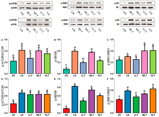 Figure 5. Effects of L-theanine on the phosphorylation status of proteins of mTOR, S6K1, and S6 in the jejunum (AC) and duodenum (DF) of mice. CK (control), HLT (LTA—400 mg•kg−1•d−1), MLT (LTA—300 mg•kg−1•d−1), LLT (LTA—100 mg•kg−1•d−1), and LG (L-glutamine—300 mg•kg−1•d−1) groups. Values are presented as mean ± SD; n = 3/group. Different superscript letters in the same figure indicate statistically significant differences (p < 0.05).