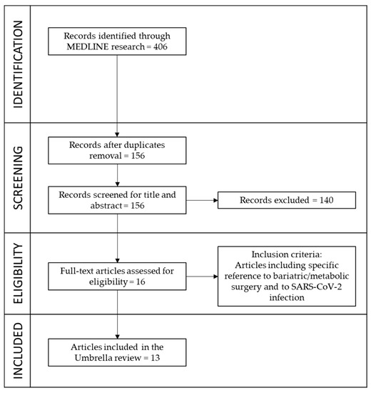 The literature search was conducted in March 2022 via Pubmed (MEDLINE) and focused on reviews, systematic reviews, and meta-analyses. Relevant keywords to the term “bariatric surgery” OR “obesity surgery” OR “metabolic surgery” were analyzed in association with “COVID-19” OR “SARS-CoV-2” using the AND modifier. Only reviews published in peer-reviewed journals were considered to meet our inclusion criteria: articles that included specific references to bariatric and metabolic surgery and SARS-CoV-2 infection either in the title, the abstract, or the text. Original and primary studies were excluded. Three different operators independently performed the search (GLDS, RP, SG). The selection process was carried out by first analyzing the titles, then the abstracts, and finally, the full text.