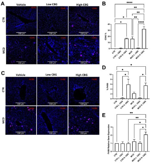 Enhanced hepatic inflammation is one of the NASH features, therefore a potential target to treat NASH is to reduce the inflammation. CBG has shown an anti-inflammatory effect in other diseases. Therefore, we evaluated the potential anti-inflammatory effect of CBG in the MCD-induced NASH mouse model. Initially, immunofluorescence staining for CD45 (Cluster of differentiation 45), a marker for leukocytes (white blood cells), was utilized to measure hepatic inflammation (Figure 3A,B). As expected, the infiltration of leukocytes (CD45+) was increased in mice fed with MCD diet, while the low dose of CBG significantly diminished the infiltration of leukocytes in mice fed with MCD diet. However, the high dose of CBG failed to lower the leukocyte infiltration in mice fed with MCD diet. In fact, the proliferation of immune cells in the group treated with high dose of CBG showed similar levels as the groups treated with MCD diet only.