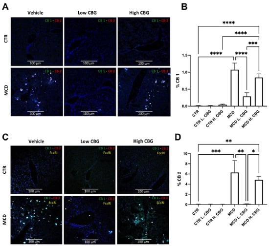 Both Cannabinoid (CB) 1 and 2 receptors were previously shown to interact with CBG [,]. CB receptors 1 and 2 were shown to play a role in liver diseases such as NAFLD, NASH, and hepatocellular carcinoma [,]. Thus, we sought to investigate whether CBG alleviated MCD-induced NASH occurs via regulation of CB receptors. First, we assessed the expression of CB receptors in frozen liver sections (Figure 5A,B,D). Both CB receptors showed increased expression in the MCD groups when compared to the CTR group, while there was a decrease in both CB1 and CB2 mRNA expression in MCD L. CBG group.