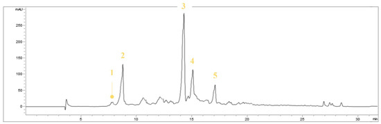 HPLC-UV recorded chromatogram at 280 nm of EVOOE. Compounds were numbered, based on their increasing retention time, as follow: hydroxytyrosol (compound 1), tyrosol (compound 2), oleocanthal (compound 3), oleuropein aglycone (compound 4), and ligstroside aglycone (compound 5).