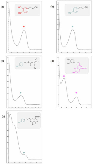 UV-DAD spectra of compounds 1 hydroxytyrosol (a), 2 tyrosol (b), 3 oleocanthal (c), 4 oleuropein aglycone (d), and 5 ligstroside aglycone (e) identified in EVOOE. In the grey panels, the structures of each compound are reported.