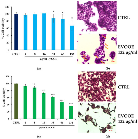 EVOOE stimulation effects on cell viability in RT112 and J82 cells. RT112 (a) and J82 (c) cells were stimulated with the indicated concentration of EVOOE (w/v) for 24 h. Cell viability was evaluated by Crystal Violet assay. Bar graphs represent the mean of three experiments (±s.e.). Symbols indicate significance: p < 0.05 (*), p < 0.0005 (**), and p < 0.0001 (***) with respect to CTRL (DMSO-treated cells). Panels (b,d) report representative images of RT112 and J82 cells, respectively, untreated (left) and treated (right) with the indicated concentrations of EVOOE and stained with Crystal Violet (optical microscope Axiovert 200 M Zeiss; 400× or 200×, bright field). The arrows in the lower panel in (b) indicate the presence of intracellular vacuoles.