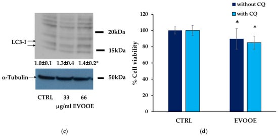 Thus, we pre-treated cells with chloroquine, a pharmacological inhibitor of autophagic flux. In the case of “protective” autophagy, following the inhibition of the autophagic flux with chloroquine, the treatment with EVOOE should result in increased cytotoxicity; alternatively, in the presence of “not-protective” autophagy, chloroquine inhibition would result in no significant change in the cytotoxic effect of EVOOE. As shown in Figure 4d, after the pre-treatment of RT112 cells with chloroquine, the subsequent addition of EVOOE (CQ + EVOOE) failed to significantly reduce cell viability compared to EVOOE mono-treatment. Therefore, we concluded that EVOOE induced a not-protective autophagic phenotype in RT112 cells.