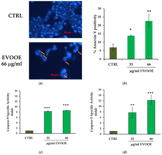 Assuming that the rapid and extensive reduction of cell viability induced by EVOOE in J82 cells was due to the induction of apoptotic cell death, as suggested by microscopy observation, the presence of apoptotic bodies was initially evaluated. As shown in Figure 5a, EVOOE strongly induced apoptosis, as evidenced by the presence of numerous apoptotic bodies after nuclei staining. To confirm this observation, other apoptotic assays were performed. The PS externalization was assessed through the cytofluorimetric assay using the binding of Annexin V. We observed that EVOOE at 33 and 66 μg/mL concentrations efficiently and significantly induced apoptosis, in a dose-dependent manner (Figure 5b), without evidence of necrosis. Subsequently, we verified the activation of caspases 9 and 3. The former is the initiator caspase in the intrinsic apoptotic pathway that proceeds with the subsequent activation of effector caspases, such as caspase-3, responsible for the cleavage of substrates, like poly (ADP-ribose) polymerase (PARP) [60]. As reported in Figure 5c, a strong increase in caspase-9 activity of approximately 8.3-fold and 8.6-fold was detected at the indicated concentrations. This increase is paralleled with Annexin V data. Similarly, EVOOE induced a significant increase in caspase-3 activity of 7.7- and 12.2-fold in J82 cells treated with 33 μg/mL and 66 μg/mL, respectively (Figure 5d).