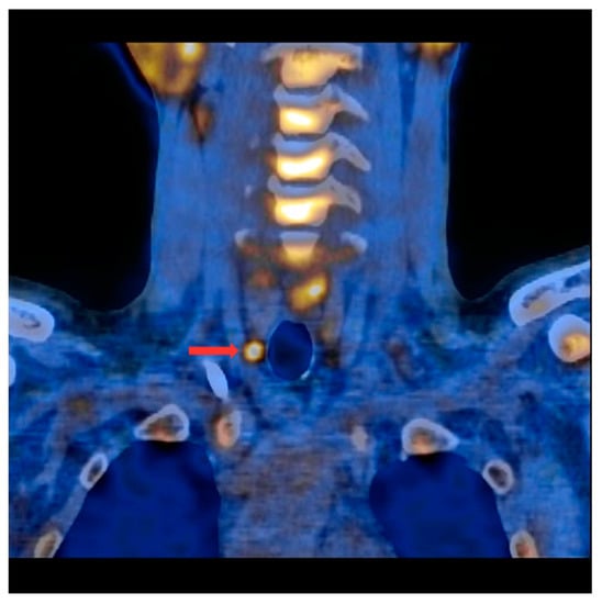 PET/CT with [11C]MET—frontal projection. Visible focus of increased radiotracer accumulation (red arrow) corresponding to the parathyroid gland below the right thyroid lobe.