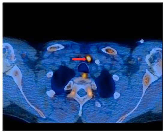 PET/CT with [11C]MET—axial projection. Visible focus of increased radiotracer accumulation (red arrow) corresponding to the parathyroid gland in front of the trachea, at the left-hand side of the midline of the body.
