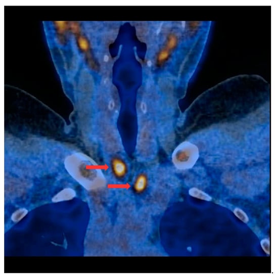 PET/CT with [11C]MET—frontal projection. Two visible foci of increased radiotracer accumulation (red arrows) corresponding to the parathyroid glands (multiple lesions) below both thyroid lobes.