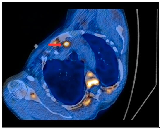 PET/CT with [11C]MET—axial projection. During the examination, the patient was laid at her left side due to the forced body position caused by numerous fractures and a brown tumor infiltrating the spinal canal (as a result of tHPT). Visible focus of increased radiotracer uptake (red arrow) in the lesion corresponding to the ectopic parathyroid gland, located in the left superior mediastinum retrosternally, and anteriorly from the initial segment of the aortic arch.