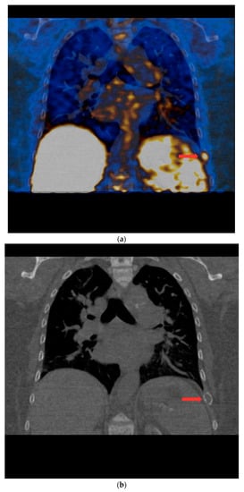 (a) PET/CT with [11C] MET—frontal projection. Visible focal increased radiotracer uptake (red arrow) corresponding to the brown tumor in the middle part of the left 9th rib. (b) Low-dose CT scan performed during PET/CT with [11C]MET in the same patient. In the location of the focus of increased accumulation of the radiotracer corresponding to the brown tumor of the left 9th rib, the distention of the contour of this rib is visible (red arrow).