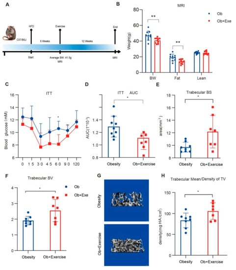 Exercise improved insulin sensitivity and bone density. (A) The eight-week-old male C57/B6 mice were fed with HFD for 6 weeks. The average body weight of the mice achieved 41.5 g after 6 weeks of HFD and before the mice started the 12-week treadmill running with HFD. Body composition was measured before and after exercise intervention. (B) Body composition was measured after exercise in the obesity and exercise groups using MRI. (C,D) measurement of plasma glucose during ITT and the AUC of the obesity (N = 9) and exercise (N = 7) groups after 8-week treadmill exercise. (E,F) femoral BS, BV in the trabecular regions of TV. (G) representative trabecular reconstruction image of the femur by μCT. The gray part of the picture shows reconstructed trabecular bones. (H) femoral bone density in the trabecular regions of TV. * p < 0.05, ** p < 0.01 2-sided Student t test. Data are presented the mean ± SD. AUC, areas under the curve; BW, body weight; HFD, high fat diet; ITT, insulin tolerance test; MRI, magnetic resonance imaging.