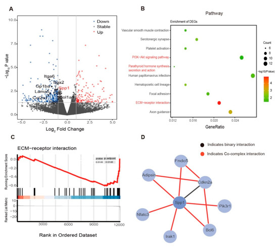 RNA-Seq of bone marrow indicated that exercise inhibited Spp1 and related ECM-receptor pathways. Representative bone marrow from tibia of both the obesity and exercise groups (N = 2,2) were isolated for RNA-Seq analysis. (A) volcano plot of bone marrow in the exercise group compared to the obesity group. Colored dots represent p value < 0.05 (−log10(p Value) > 1.3, gray line), log2Fold Change > 1 up-regulated genes (red), and log2Fold Change < −1 down-regulated genes (blue). Selected ECM-receptor pathway related genes are highlighted. (B) results of pathway enrichment analysis for highly variable genes identified by significant DEG in the bone marrow. (C) gene set enrichment analysis of ECM-receptor interaction. (D) protein interaction network diagram of Spp1. The original data come from the HINT (http://hint.yulab.org, accessed on 31 May 2022) database, a database of high-quality protein–protein interactomes. ECM, extracellular matrix.