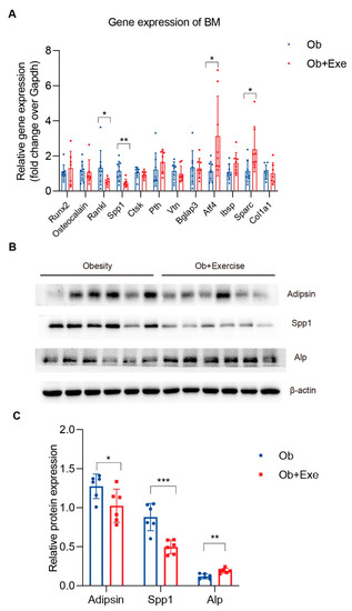 To further investigate the potential mechanism of exercise-induced bone remodeling, we isolated tibia bone marrow from both the obesity and exercise groups and examined the gene expression of some representative genes involved in bone remodeling (Figure 3A). It is well-known that Runx2 is responsible for inducing the differentiation of multipotent mesenchymal cells into immature osteoblasts [40]. In our obese mice model, exercise had no impact on the gene expression of Runx2 (Figure 3A). However, our results showed that Atf4, the regulator of osteoblast differentiation, was significantly upregulated after exercise (Figure 3A). Meanwhile, we also found that the expression of Alp protein, a marker of osteoblast differentiation maturation, was upregulated after exercise (Figure 3B,C). We evaluated critical factors involved in bone resorption, such as Rankl and Spp1. Consistent with our RNA-seq results, Spp1 was reduced by 60% by exercise at gene levels. In addition, we found that Spp1 protein levels were also significantly down-regulated, which means that osteoclasts cannot be anchored to the bone surface and thus interrupt the bone resorption process (Figure 3A–C). Rankl, another critical factor for osteoclast function, mediates bone resorption and overall bone density. A decline of it in the process of exercise could reduce osteoclast activity [41] (Figure 3A). These data strongly indicated that exercise could increase bone density in obese mice by inhibiting bone resorption. Meanwhile, other studies have shown the reduction in BMAT by exercise [35]; we wonder about the role of BMAT played in bone resorption. As the executor of bone resorption, osteoclast is modulated by several hormones, the immune system, and osteoblasts. Adipsin is an adipokine that in humans is encoded by the CFD gene, and it is mainly synthesized and secreted by adipocytes. It has been shown that adipsin can promote bone marrow adiposity [19]. In addition, adipsin, as a rate-limited enzyme involved in the alternative complement pathway, is required for efficient osteoclast differentiation [20,21,26]. Therefore, we asked whether exercise could decrease adipsin so as to inhibit bone resorption. Indeed, adipsin was significantly reduced 19.6% in the bone marrow by means of exercise compared to the obesity group (Figure 3B,C).