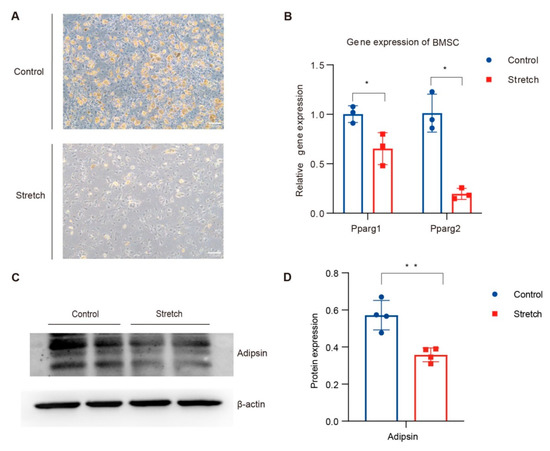 Exercise inhibited adipogenic differentiation of BMSCs and decreased adipsin in vitro. Isolated tibia mesenchymal stem cells were divided into control group and stretch group during adipogenic differentiation (N = 3). (A) representative images of control and stretch groups under a 10× phase-contrast microscope at the end of adipogenic differentiation. (B) quantitative PCR analysis of adipogenic relative gene expression in the BMSCs, containing Pparg1 and Pparg2. (C,D) representative Western blotting images and protein expression quantification (N = 4) of adipsin from mesenchymal stem cells treated with adipogenic differentiation and stretch stimulation. * p < 0.05, ** p < 0.01 for control group vs stretch group. Two-sided Student t-tests were used for statistical analyses. Data are presented as the mean ± SD. BMSCs, bone mesenchymal stem cells.