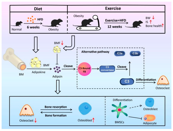 Exercise inhibited adipsin-mediated complement pathway activation on osteoclasts. Adipsin plays an essential role in C3 convertase forming and activation of the subsequent alternative complement pathway. As the central component of the complement pathway, C3 and the complement pathway are important in osteoclast differentiation. Exercise inhibits the adipokine adipsin expression and affects osteoclasts through its mediated complement system. In addition, exercise can restrain BMSC adipogenic differentiation to protect bone health. IS, insulin sensitivity; BW, body weight.