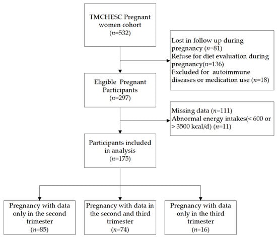 During the follow-up until delivery, a total of 175 pregnant women were included in this study after excluding those who were lost to follow-up during pregnancy, those who refused diet evaluation during pregnancy, those with autoimmune diseases or anti-inflammatory medication use, those who did not complete the nutritional supplementation status questionnaire, and those with a total energy intake <600 or >3500 kcal/d. Seventy-four pregnant women participated in both the second- and third-trimester surveys. Eighty-five pregnant women completed follow-up only in the second trimester; sixteen women completed follow-up only in the third trimester (Figure 1).