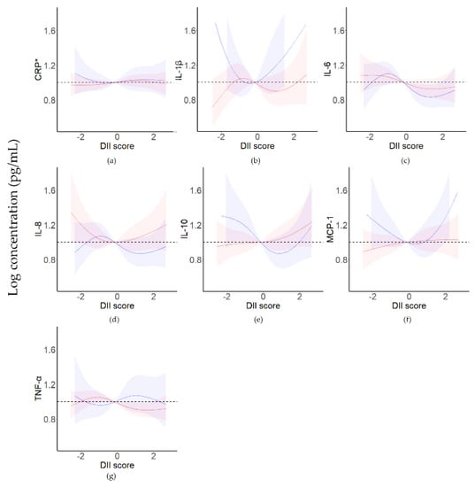 Restrictive cubic spline analysis of cytokine levels and DII scores for pregnant women in the second and third trimesters. The red line represents pregnant women in the second trimester (n = 159); the blue line represents pregnant women in the third trimester (n = 90). CRP, C−reactive protein; IL, interleukin; MCP−1, monocyte chemoattractant protein−1; TNF−α, tumor necrosis factor−α. (a) CRP, (b) IL−1β, (c) IL−6, (d) IL−8, (e) IL−10, (f) MCP−1, (g) TNF−α. Energy intake, age, education level, annual household income, and BMI were used as covariates. * CRP level is the logarithm of the cytokine level (ng/mL).
