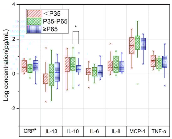 Maternal inflammation levels during pregnancy play an important role in fetal development, and cytokines such as interleukin 1β (IL-1β), IL-6, and monocyte chemoattractant protein-1 (MCP-1) change with the progression of pregnancy [1]. An exacerbated inflammatory response in pregnant women is not beneficial because it can affect the health of both the pregnant woman and the fetus [2,3]. A large number of studies have shown that high cytokine levels are associated with pregnancy complications (e.g., gestational diabetes, C-reactive protein (CRP), and IL-6 levels [4,5], gestational hypertension and CRP levels [6], preeclampsia and tumor necrosis factor-α (TNF-α) levels, IL-6 levels, IL-8 levels and hematological parameters of systemic inflammation (NLR/MPV) [7,8]) and adverse birth outcomes (e.g., low birth weight infants and CRP levels [9], premature delivery and CRP levels [10], prolonged pregnancy and IL-8 levels [11]). Maternal immune system diseases and serum IL-1β, IL-6, MCP-1, and TNF-αlevels can even affect the neurodevelopment of offspring [12,13,14,15,16]. TNF-α, CRP, IL-1β, and IL-6 levels are common indicators of inflammation [17,18,19]; IL-10 is one of the main anti-inflammatory markers in the human body [20]. MCP-1 and IL-8 are associated with the health of mothers and their offspring [11,15]. Therefore, seven cytokines (TNF-α, IL-1β, CRP, MCP-1, IL-6, IL-8, and IL-10) were included in this research.