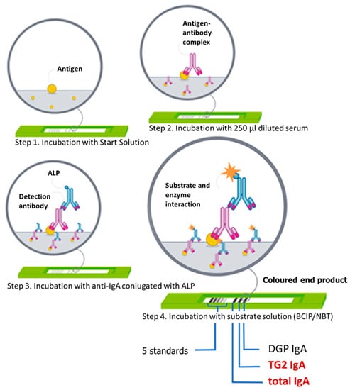 Schematic steps of the multiparametric immunoassay quantitative test Polycheck® Celiac IgA plus total IgA (Biocheck, GmbH, Münster, Germany). BCIP/NBT = 5′bromo-4′chloro-3′indolylphosphate/4′ nitrobluetetrazolium; ALP = alkaline phosphatase.