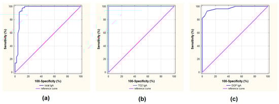 ROC curve and AUC for tIgA (a), TG2 IgA (b) and DGP IgA (c) on the panel Polycheck® Celiac IgA plus total IgA.