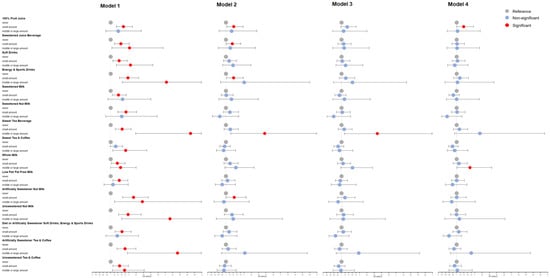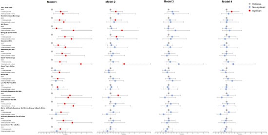 We used forest plots to visualize the binary logistic regression results of different types of beverages (Figure 2 and Figure 3). In model 1, every type of SSB is significantly associated with MPHL as a risk factor. After adjusting for confounders, most SSBs still have a tendency to increase the risk of MPHL, especially juice beverages, soft drinks, energy and sports drinks, and sweetened tea beverages, which remain significant in model 2. Regarding beverages without added sugar, artificially sweetened nut milk and pure fruit juice are also potential risk factors for MPHL.
