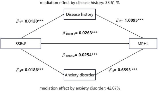 In addition, we conducted mediation analysis using anxiety disorder status and disease history as mediators (Figure 4). SSB intake frequency significantly predicts MPHL, and the mediator disease history is significantly associated with SSB intake frequency and significantly affects MPHL. The contribution of disease history to MPHL is significant. The bootstrapping analyses showed that the indirect effect is significant (βindirect = 0.0121, 95% CI = [0.0077, 0.0180]). Thus, disease history mediates the association between SSB intake frequency and MPHL. Similarly, there are significant associations between SSB intake frequency and anxiety disorder, and between anxiety disorder and MPHL. Moreover, the indirect effect of anxiety disorder is significant (βindirect = 0.0122, 95% CI = [0.0083, 0.0170]). We can infer that anxiety disorder status mediates the association between SSB intake frequency and MPHL.